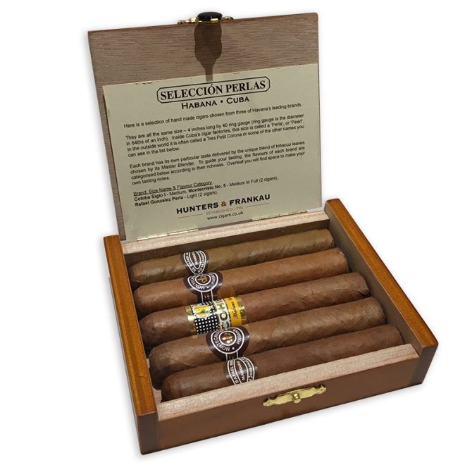We are pleased to offer the extremely popular Habanos Seleccion Perla gift box. Housing five Perla sized Habanos (4″x40), the box now contains 2 x Montecristo No.5s, 2 x Rafael Gonzalez Perla’s and 1 x Cohiba Siglo I. The original seleccion box used to contain a R&J Petit Princes and a Punch Petit Punch before these two lines were discontinued by Habanos S.A. The “Perla” size is proving to be a very popular vitola, particularly in the UK where smoking restrictions and climate sometimes demand a quick 20 minute smoke. Contents:1 x Cohiba Siglo I (Medium Flavour)2 x Montecristo No.5 (Medium – Full Flavour) 2 x Rafael Gonzalez La Perla (Light Flavour)Only available in United Kingdom
